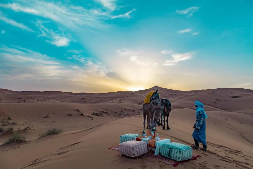 Lo primero es visitar el pueblo de Khamlia y ver en directo una demostración de música de Gnawa. Luego al pueblo abandonado de de M’fis y pequeñas aldeas lejos de toda civilización. También visitaremos a una familia nómada y tomaremos el té con ellos. Al atardecer, montaremos los camellos por las dunas para ver un atardecer inolvidable y pasar un mágica noche en el desierto, en el campamento
