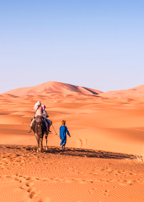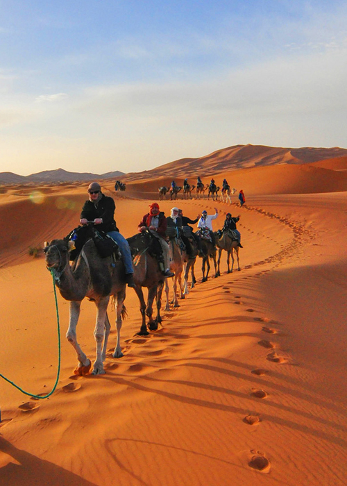 Atravesarás climas muy distintos: desde el calor de Marrakech y el desierto hasta el posible frío de Ifrane y las montañas del Atlas. Recomendamos vestir "por capas" y llevar una chaqueta para la noche en el campamento, además de calzado cómodo para caminar por las Kasbahs y las dunas.
